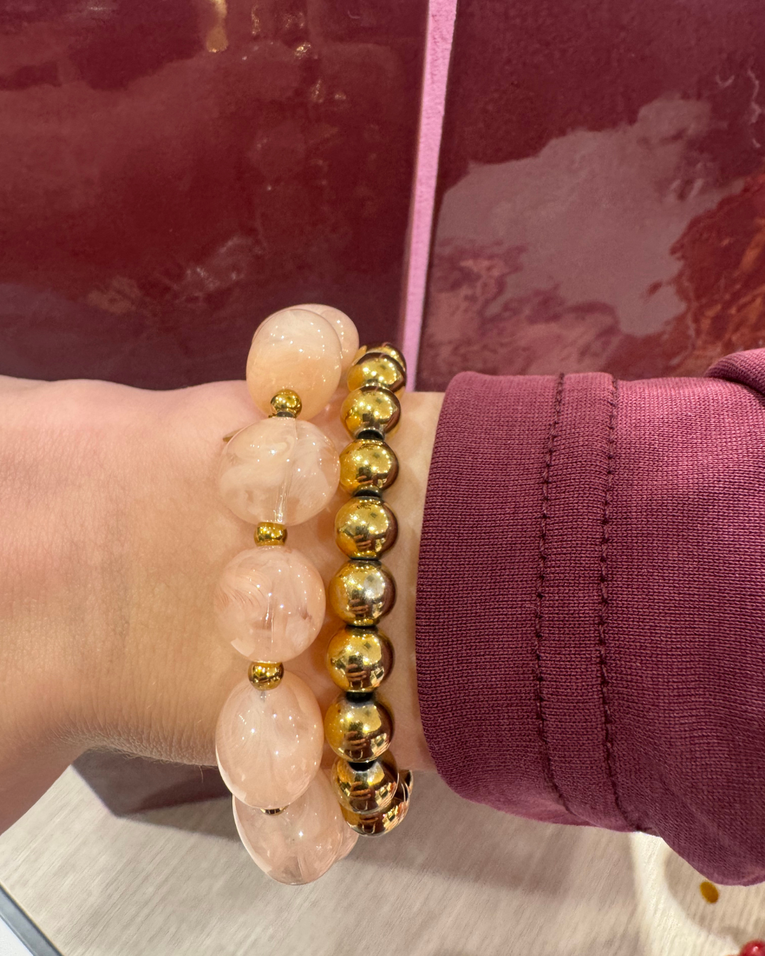Mooie armband, zachtroze met klein marmer effect. Armbandje op stiek waardoor het altijd past! Leuk om alleen te dragen om te combineren met andere armbandjes.
