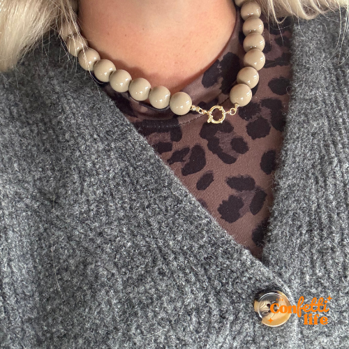 Deze Bubblegum in taupe kleur ketting is een echte statement piece. De grote glanzende kralen in een zachte taupe tint geven elke outfit een stijlvolle, speelse touch. De sluiting is gemaakt van hoogwaardig stainless steel, waardoor hij niet verkleurt en jarenlang mooi blijft.