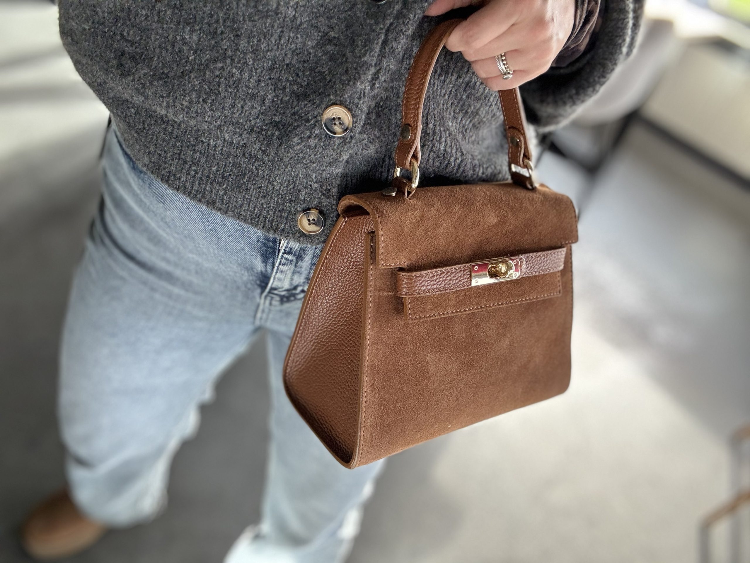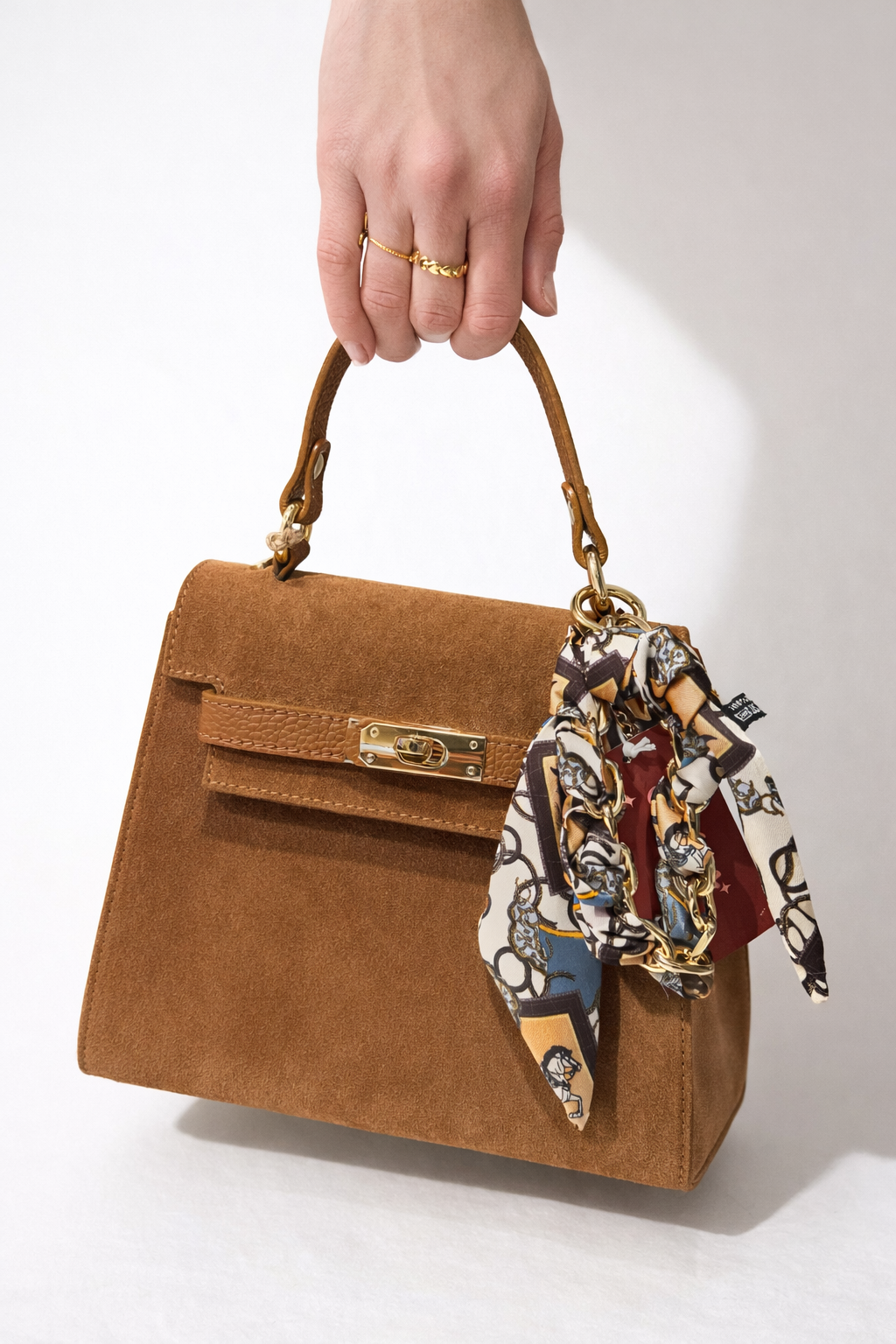 Dit cognackleurige tasje van echt suède is een tijdloze musthave in jouw collectie. De warme cognac tint, het zachte suède en de goudkleurige draaisluiting geven het tasje een luxe, chique uitstraling die bij elke outfit past. Perfect voor dagelijks gebruik of een avondje uit!